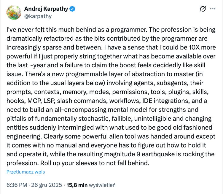 Andrej Karpathy - współzałożyciel OpenAI, ex-Director of AI w Tesli, twórca terminu Vibe Coding i totalny autorytet w przestrzeni ML/AI też boryka się z podobnym problemem. W swoim tweecie pisze o byciu w tyle jako programista i natłoku nowości.