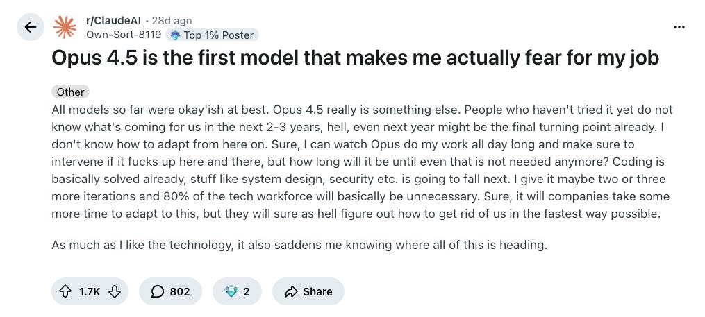 Druga strona medalu to po prostu strach, często o swoją przyszłość zawodową. Użytkownik na Reddicie podzielił się swoimi obawami w poście, który zyskał sporo polubień. Ludzie po prostu się z tym utożsamiają i nie ma co się dziwić. Claude Code jest teraz w szczycie popularności.